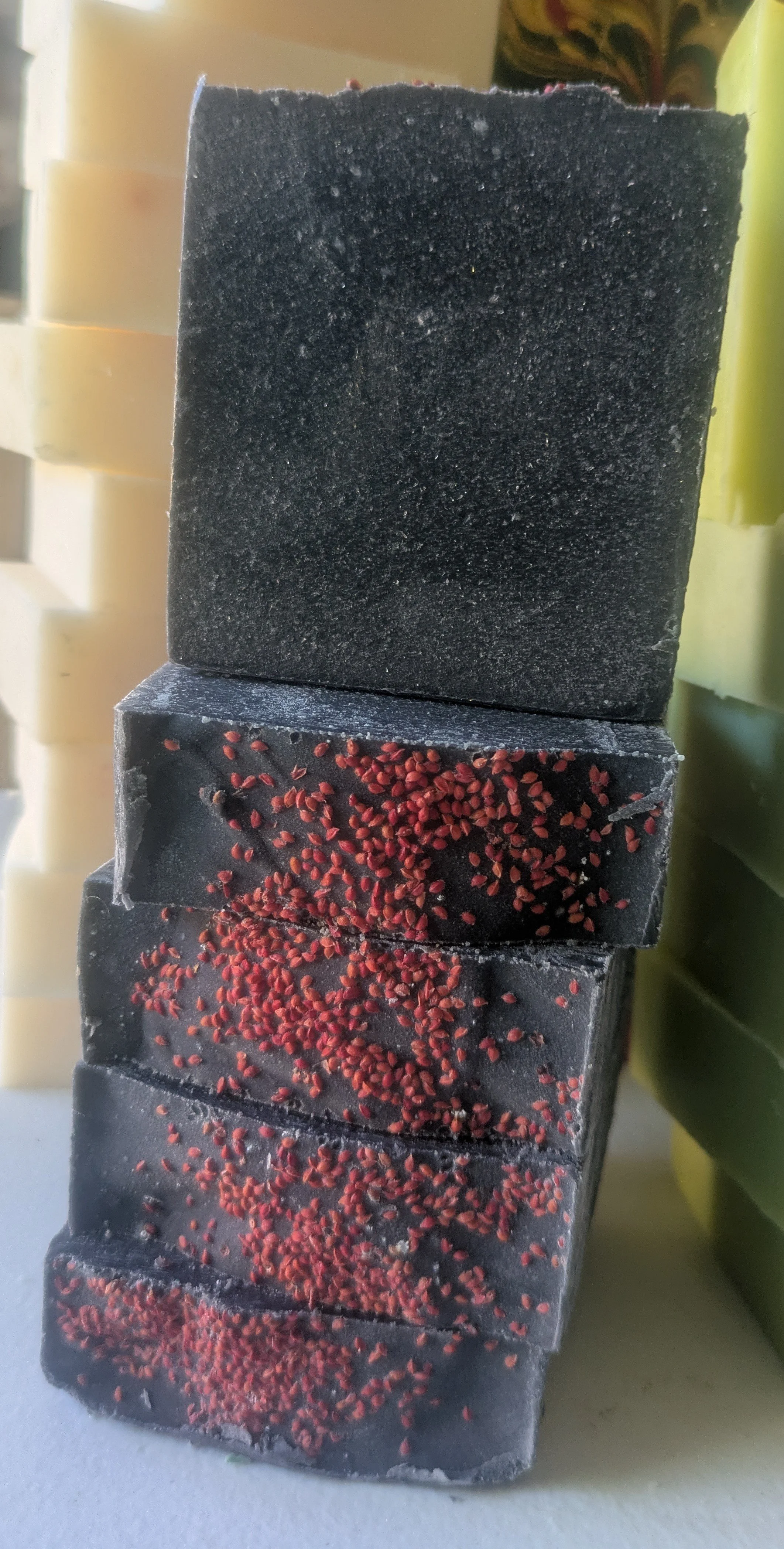 Beautifully scented with a tobacco and bay leaf fragrance, is bar is full of activated charcoal and topped with a sprinkling of cranberry seeds.